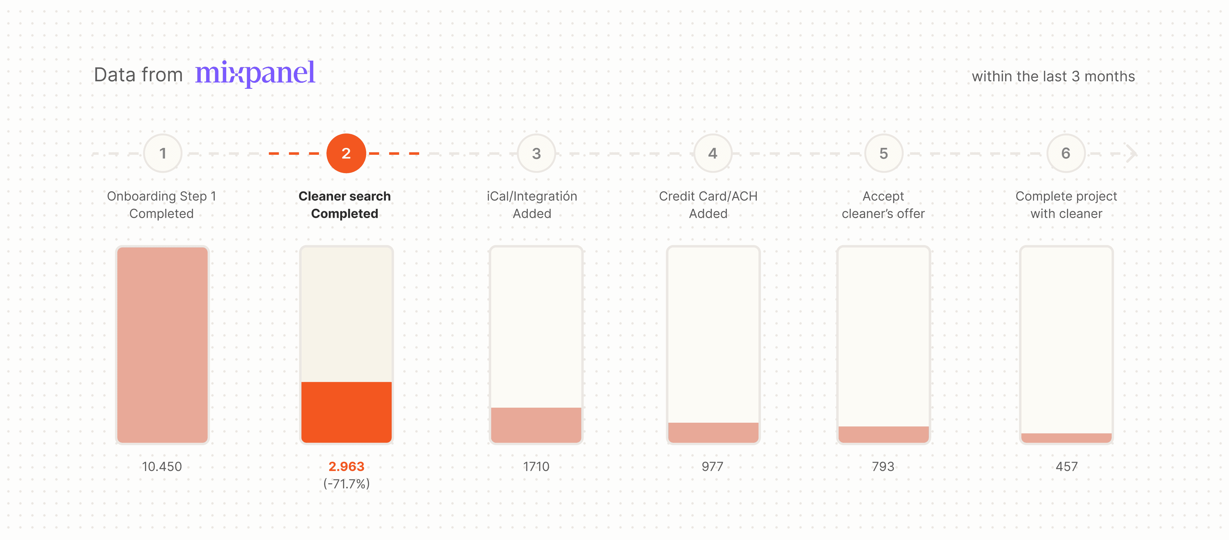 A significant number of new users were leaving the platform before completing their first meaningful action (Create a cleaner search) without experiencing the value of the app. This churn represented a potential loss of up to USD $720K per month in Monthly Recurring Revenue (MRR).